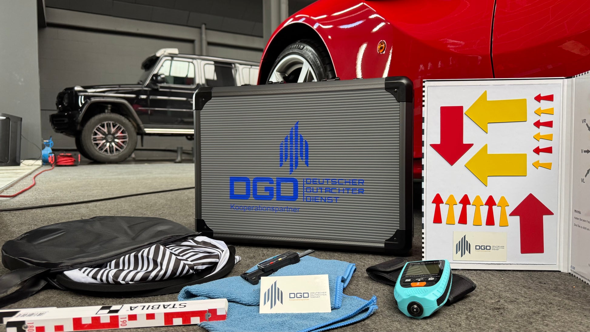 Mit dem SV-Koffer von DGD Direkt erhältst du die perfekte Ausrüstung für den Einstieg als Sachverständiger – kompakt, hochwertig und sofort einsatzbereit
